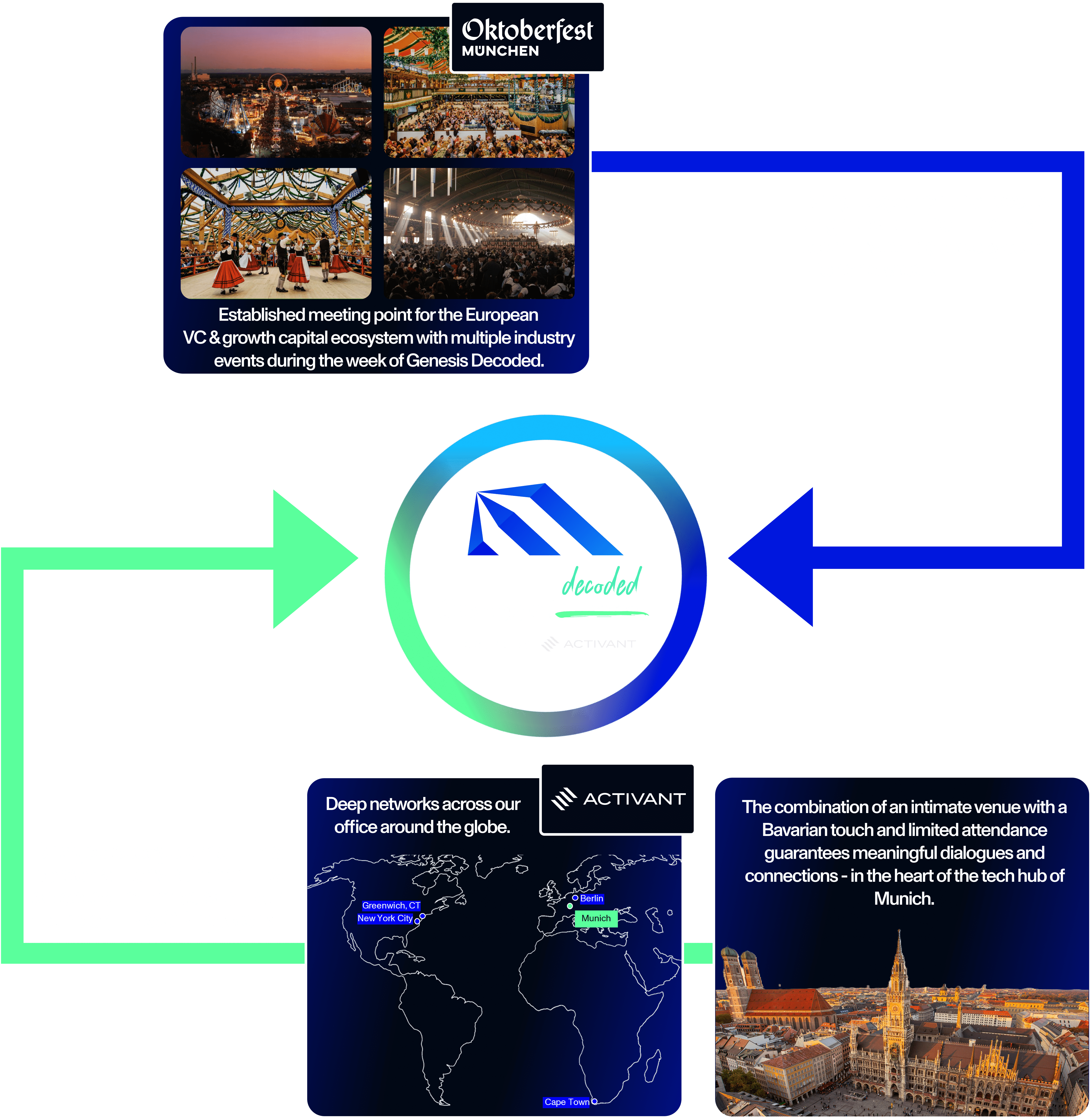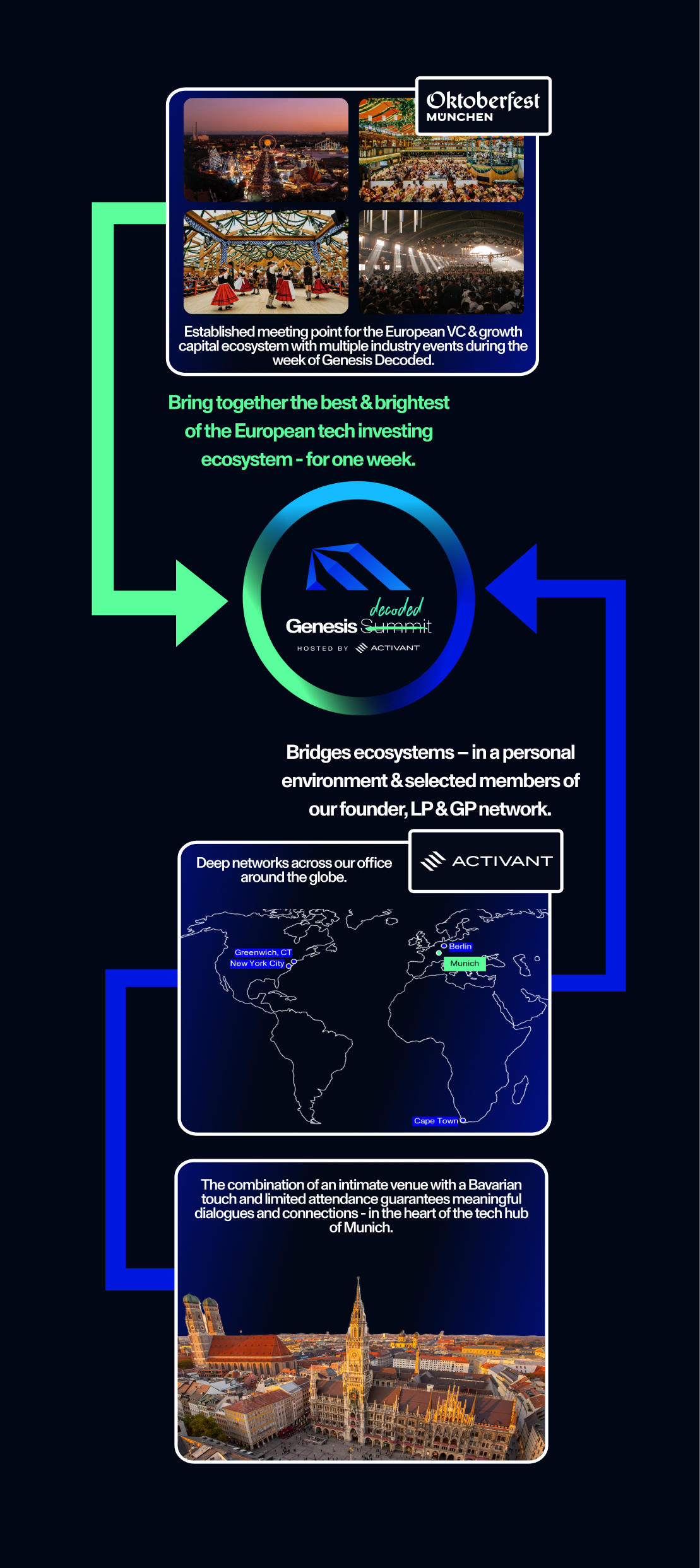 Bits & Pretzels and the Oktoberfest bring the best and brightest of the European VC & growth capital ecosystem - in Munich, for one week in September. By hosting the Genesis Decoded around these two great events, we are able to leverage the dense gathering that already exists - and create a more personal space to interact on top.